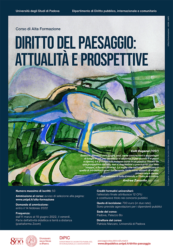 Il Corso intende offrire, agli operatori (pubblici e privati) del settore, un'opportunità di aggiornamento ed approfondimento delle questioni giuridiche centrali e più attuali della complessa disciplina giuridica sul paesaggio. I dipendenti delle pubbliche Amministrazioni interessate (Ministero della Cultura, Regioni, Città metropolitane, Comuni, Enti parco, etc.), così come i liberi professionisti impegnati nel settore, potranno in tal modo affrontare al meglio le prossime sfide poste dal PNRR, dalla pianificazione paesaggistica e dai più recenti interventi legislativi di semplificazione.